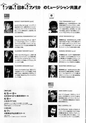 日本から参加したのは高橋親子に、三宅榛名、梅津数時の4人。さらにアメリカからはジョン・ゾーンとビル・ラズウエルの2人。ソ、日、米の時代の先端をいく、ものすごいメンバーでしたが、その頃の私はまだそれほどジャズに親しんでいたわけでなく、このミュージシャンたちのスタンスも理解していませんでした。逆に言えば、先入観なくいきなり世界のトップの音を体験できたことは素晴らしかったのですが。