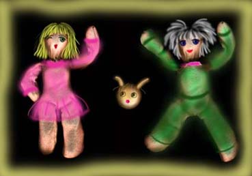 自作の白人形をスキャナーに乗せて取り込んだものに顔を描いて彩色。白人形とは、紙粘土で体のパーツを作り、白い布で縫いぐるみにしたものです。関節部が自由に動くので左と右のようにポーズを変えられます。真ん中の丸いのは、紙粘土のボールをスキャンしてから顔を描きました。