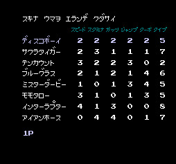 2頭目のスピード4。スタミナ1のガッツ3と、ミス無しならばそこそこ行けそう。ただ、ジャンプ0は痛いので、序盤で一つでも取らないと厳しい。当時はエクスプレスと人気を二分していた筈。筆者はエクスプレス派。