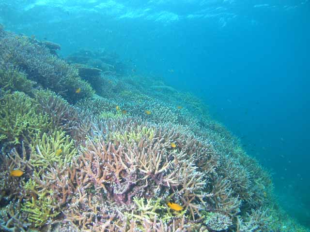 ちょっと濁っているのは残念ですが、見事な珊瑚が大きい根の周りを覆っています。遠くが霞んじゃってるよお。