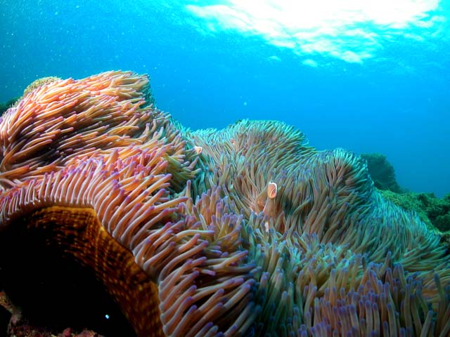 ちょっとうねりが強くイソギンチャクが揺れすぎてなかなか形を作るのには苦労しました。クマノミもちょっと小さかったかなあ。ドームを使って奥行きを出して見ました。