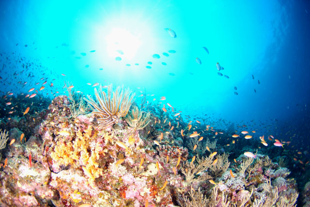 ドロップオフ沿いにはハナゴイの乱舞。中層にはカスミチョウチョウウオ。