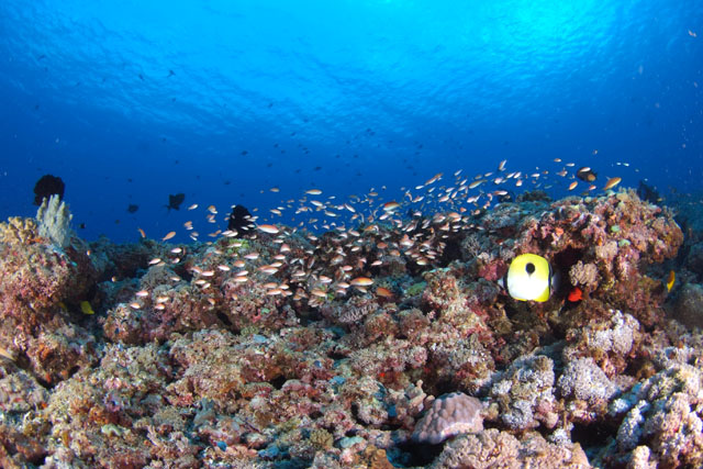 肌色の幼魚の中で一際目立つ黄色いチョウチョウウオ。