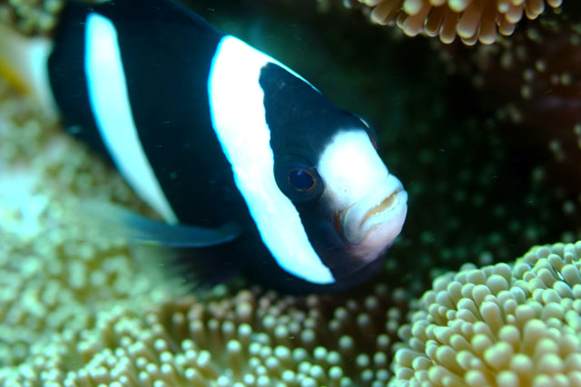 砂辺のクマノミは真っ黒。ちょっとお洒落じゃないけれど迫力はあります。