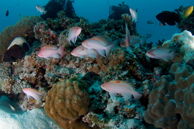 群れるケラマハナダイの雄。綺麗なカラーが沢山。
