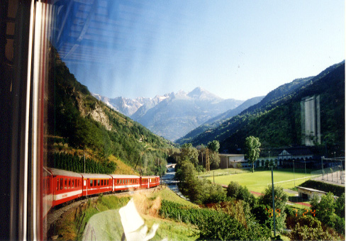 朝8:10Zermatt発の電車に乗るべく宿を出るが、はじめ朝夜勤の管理人がT/Cを受け付けてくれない様子だったので(本当は使用可)、説明をして、ちょっと強引にチェックアウトする。その後、真っ赤な氷河急行の車窓から渓谷の景色を楽しみつつ朝食を摂り、9:22にVisp着。ここから9:31発Lausanne行きに乗り換える。