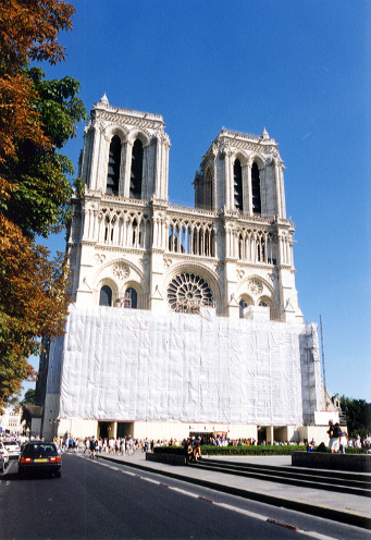 ポンヌフ経由でシテ島に渡り、ノートルダム寺院へ。 残念ながら、ファサード下半分は修復中。 |