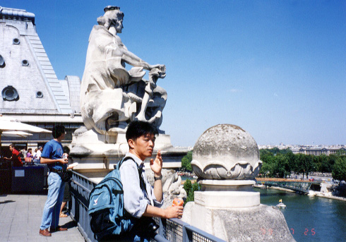 オルセー美術館上階の喫茶室で昼食のあと、外(隣)にあるテラスに出る。 セーヌ川沿いの眺望を楽しみつつ煙草を一服、の図。 (ただし妻の指示によるヤラセ…) |