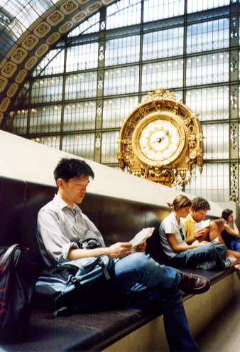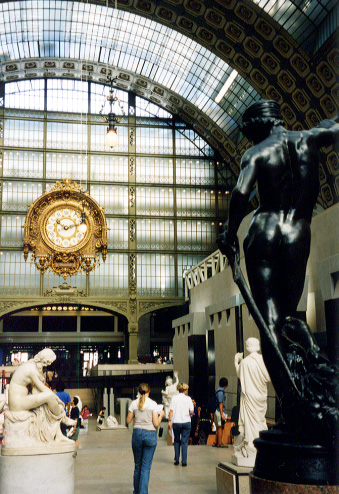 オルセー美術館の地上階にて(入館直後)。 ダヴィデの背中から正面入口上の大時計をのぞむ。 |