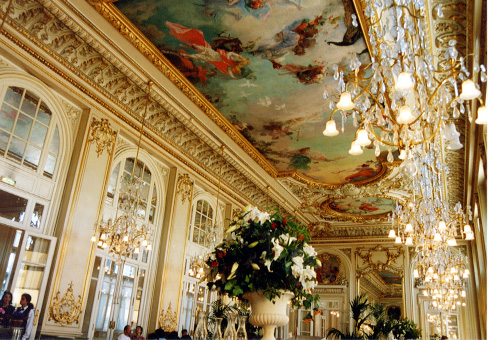 観賞後、中階レストランにて軽食をとり、くつろぐ。 天井画・シャンデリア等、噂通りの豪華さ。 |