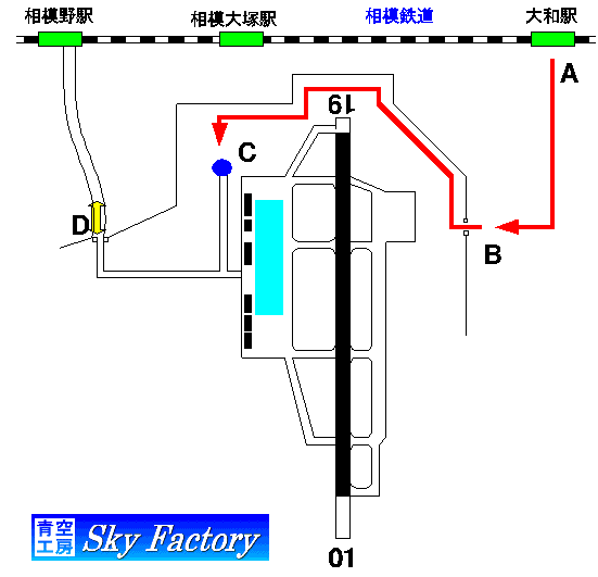 航空祭当日は、大和駅(A)より、シャトルバスが運行されます。シャトルバスは、イーストゲート(B)より、入場し滑走路の19エンドを通ります。バスからの降車場所は(C)付近です。(下図参照)。また、相模大塚駅からもシャトルバスが運行されるます。 降りると手荷物検査があります。バックを開けて、危険物がないことを係官に示してください。拒否すれば追い返されるか、拘束されて取り調べを受けるかもしれません。 帰りのシャトルバスは、降車した(C)から出ます。 また、正門(D)から出て、道なりに真っ直ぐ進むと相模野駅にでます。正門から、相模野駅までは約1.5kmです。また、会場から正門まで1.5kmぐらいでしょうか。 厚木に限らず、米軍の基地は広く、長い距離を歩くことを覚悟する必要があります。 |
