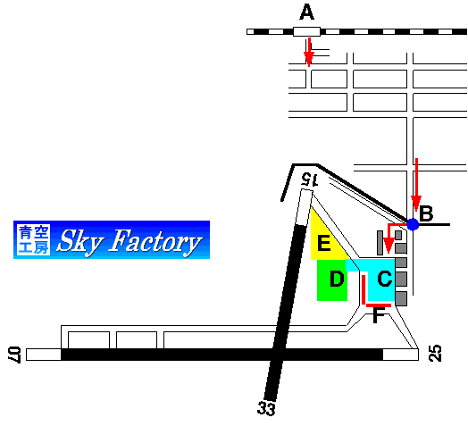 会場として、解放されているのは(C)、(D)、(E)です。 エプロンは水色の部分(C)です。(D)は草地で、(E)は駐車場です。地上展示機は赤線で示したように配置されます。(C)の中にも展示されます。(D)から地上展示機を後ろから撮影可能です。 ブルーインパルスは、滑走路に面した側、(F)とかかれた所に配置されます。 航空祭当日は滑走路(15−33)は、使用しません。離着陸は、25を使用することが多いので、会場遠くで離陸するので、撮影はつらいです。 また、飛来機は、滑走路(07−25)上を航過してきます。 松島基地は、ブルーインパルスのホームベースであり、その為か、ブルーインパルスは、午前と午後の2回展示飛行します。午前は天気に関係なく、水平系の第3区分が行われます。展示飛行は、上図のSkyFactoryのロゴのあるあたりで行われます。 ブルーインパルスJr.も午前、午後の2回展示を実施します。 |