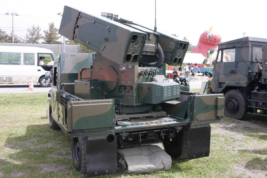 93式近距離地対空誘導弾。91式地対空誘導弾と同じミサイルを8発搭載。助手席に射撃用コンソールがあります。コンソールを見ると、単に91式を8発搭載しただけでなく、射撃指揮装置などにより、いろいろできるようです。 |