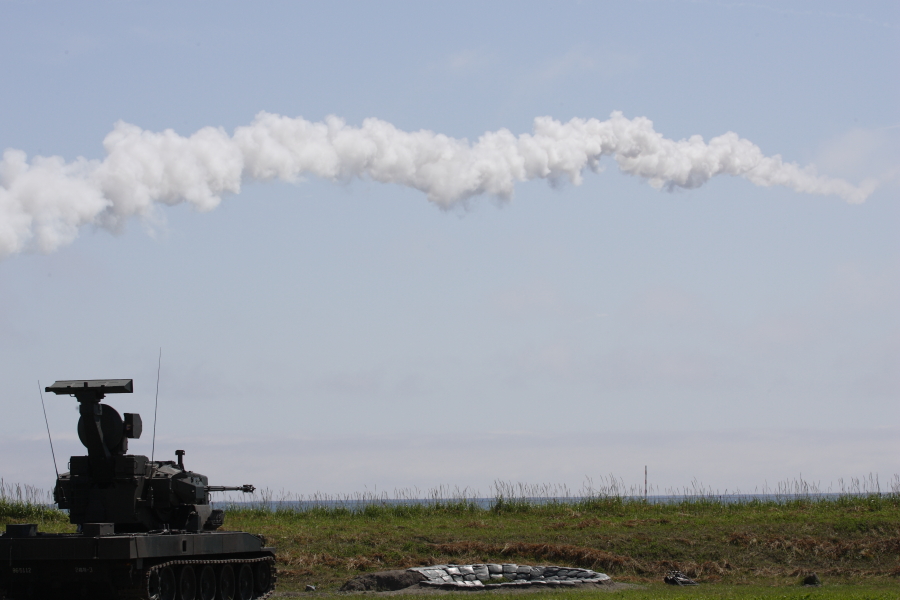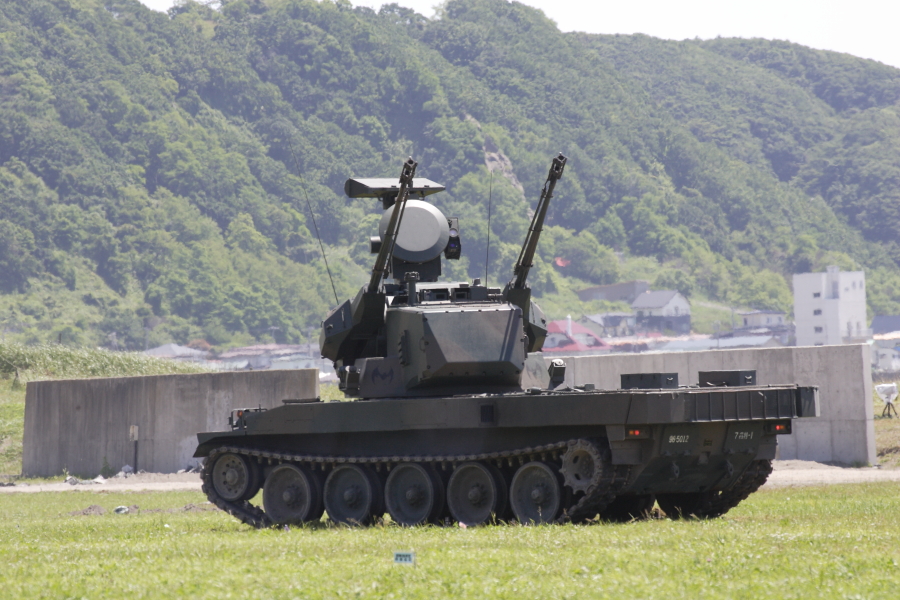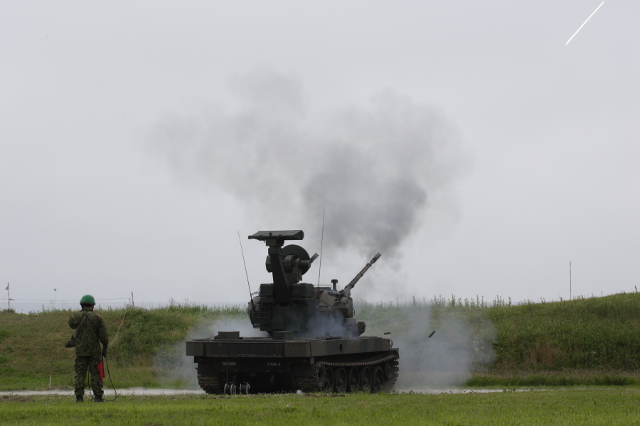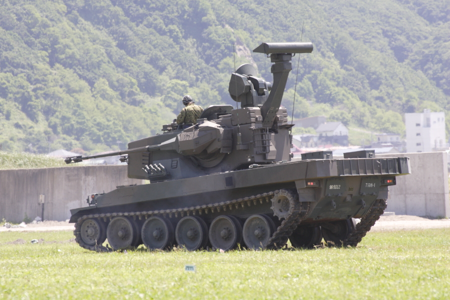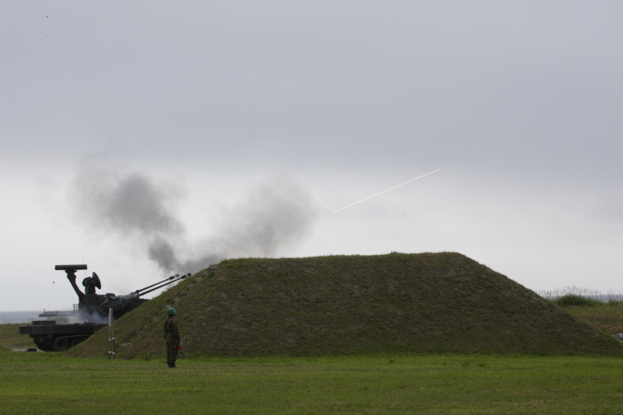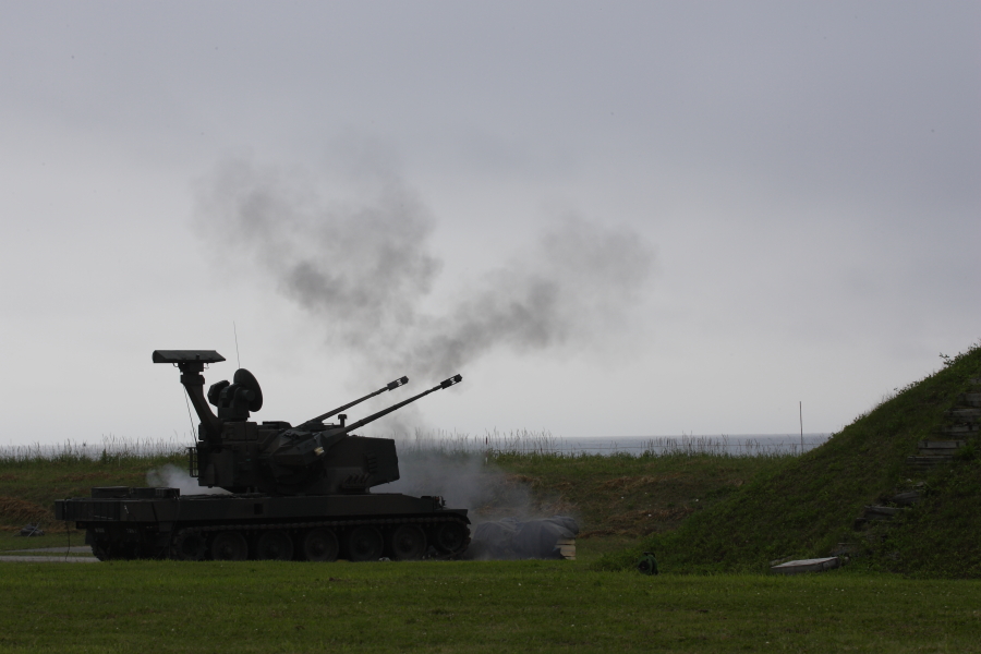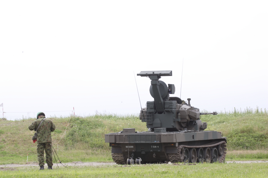 | 実射に備えて待機中の87式自走高射機関砲。画面奥は海です。海上に向けて射撃します。撃った砲弾は海面に落下しますので、実射時には射撃海面への船舶の進入は禁止されます。 |
