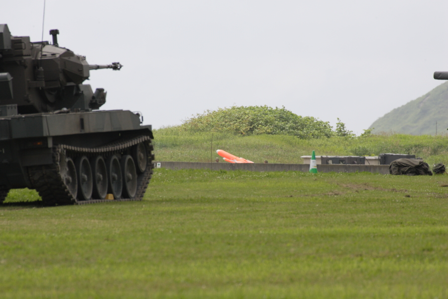 いよいよ対空ミサイルの実射。最初に標的曳航機(無人機)を発射します。オレンジ色の物体が発射を待つ曳航機。派手なオレンジ色の炎が吹き上がったら、あっという間に画面から消えました。 |