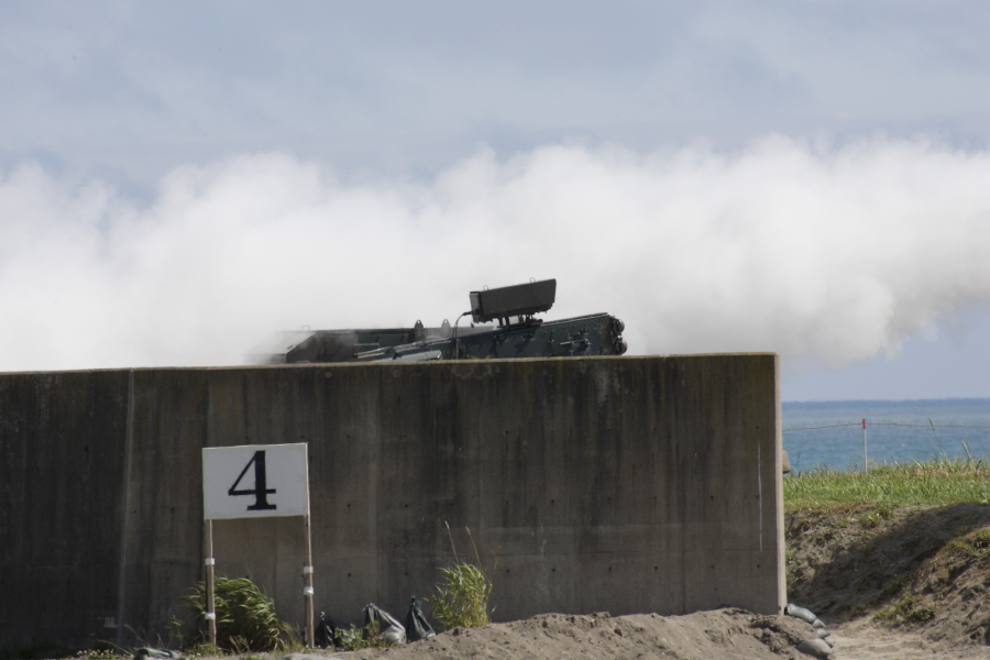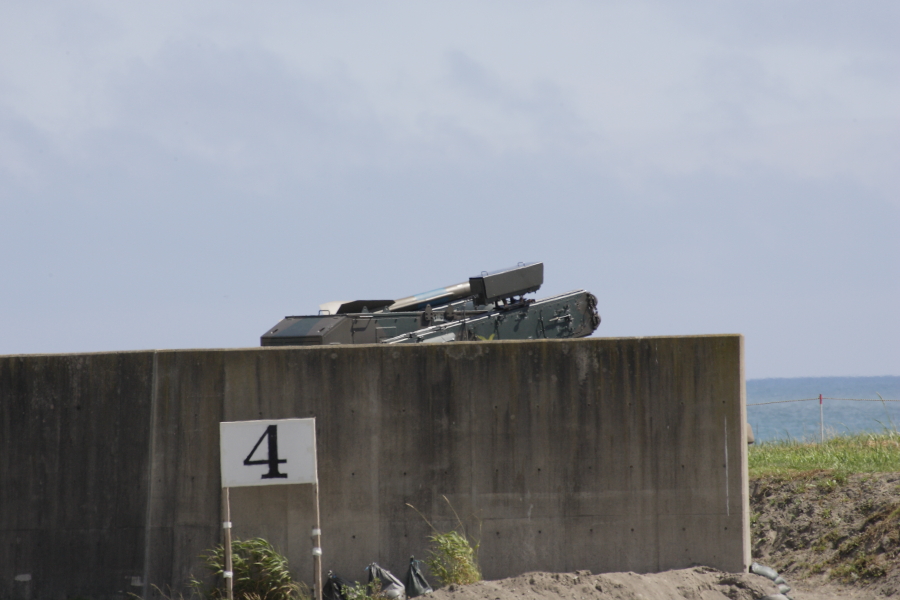 | 87式の実射のあとは対空ミサイル実射の予定でしたが、射撃場海面に船舶がし進入したので、午後に延期。場を持たせるために87式が展示機動を行います。姿勢制御で車体を前方に傾けています。 |