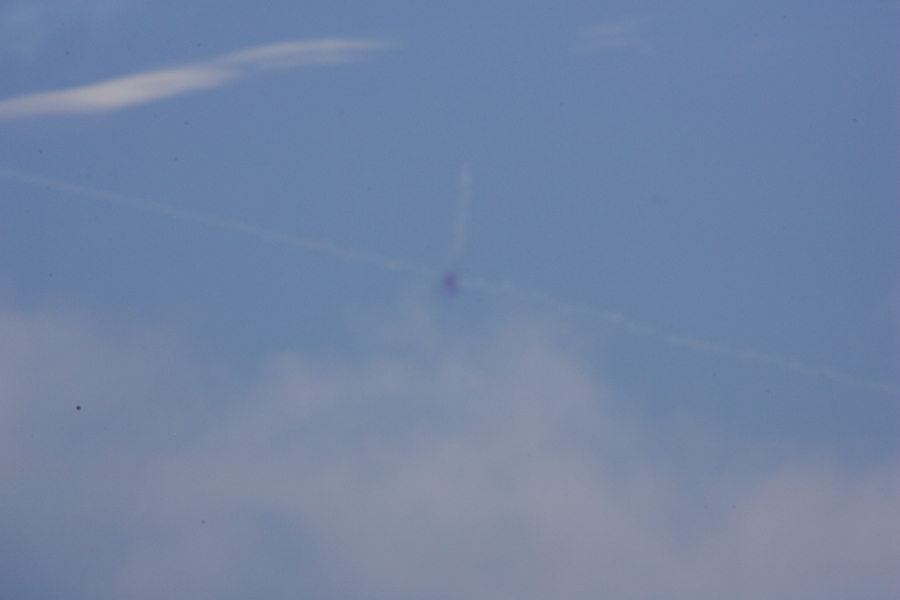 ピンボケで申し訳ない。画面中央の黒点が命中を示す黒煙。画面を横切る細い白煙は、標的機が出したスモークです。黒煙から画面奥に向かう白線はミサイルの白煙。標的に命中です。距離は10Km強です。肉眼ではかろうじて黒点が見える。ぎりぎり有視界戦闘か。これが現代の交戦距離でしょうか。 |