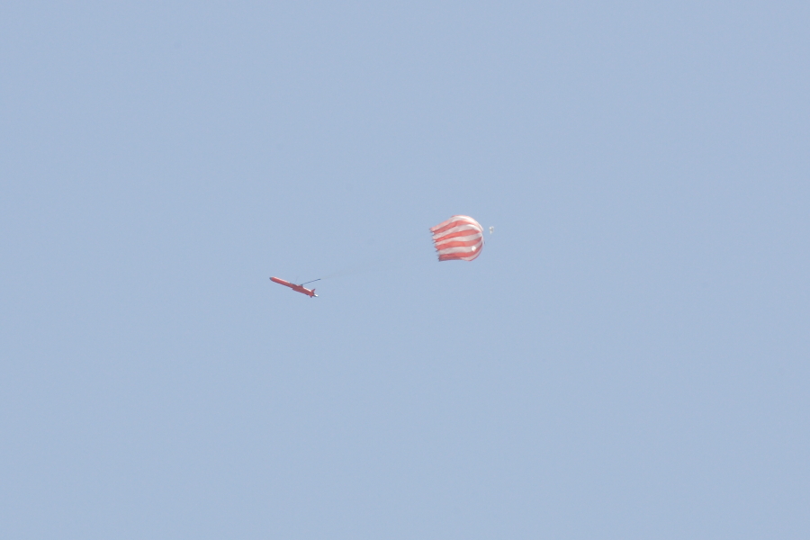 | 海上近くに曳航機を呼び寄せ、パラシュートで回収します。機体は海面に着水しますので、回収のため漁船がチャーターされます。曳航機は、射撃場から20km〜10kmの空域を旋回していましたが、肉眼ではみえません。視認しやすくするためにスモークを出してくれるのですが、スモークは見えても、スモークの先の機体はみえません。 |