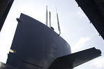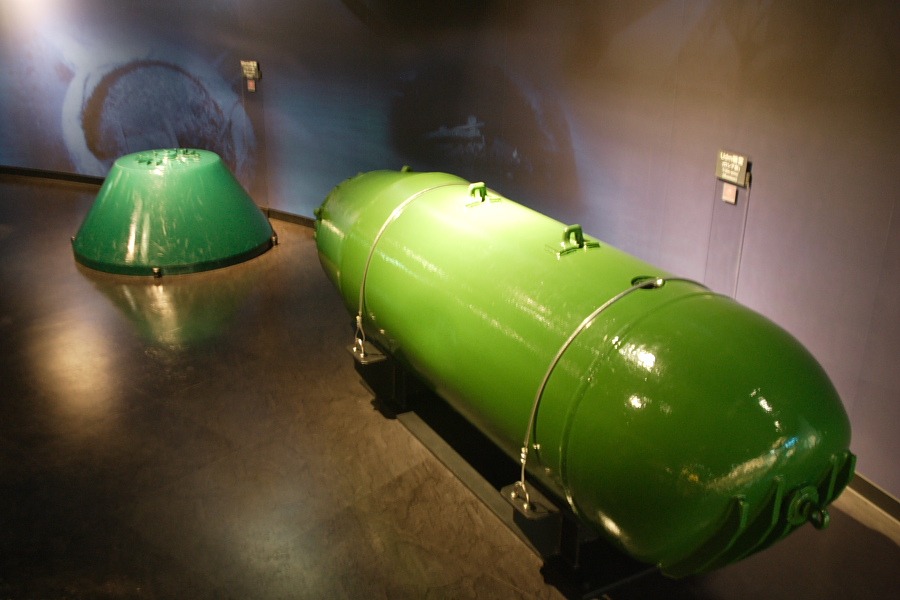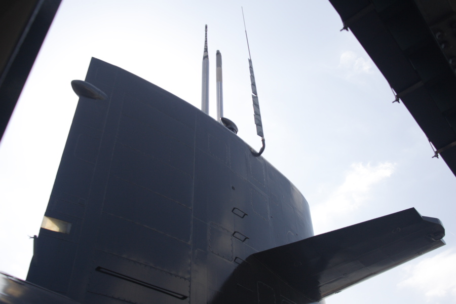 「あきしお」内部は公開されていますが、発令所は撮影禁止でした。発令室内部は、左前方に航空機のような操舵輪が2組(まるで窓の無い大型旅客機のコクピットです)、左側面に各種バルブ類。中央に潜望鏡、右側面にソナーやレーダ表示装置、右後方が海図台です。深度計や圧力関係の表示機は、潜航深度がわからないように、数値表示の無い目盛のみの展示用に交換されています。また、ソナー表示装置は、完全なダミーで、真偽不明の表示写真が貼り付けてありました。 発令室の下が魚雷発射管室で、発令室の床の一部をガラス張りに改装して、見れるようにしていました。