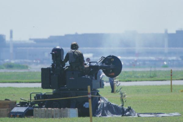 F-1を迎え撃つ対空機関砲VADS。空砲発射を行う。空薬莢が排出されている。