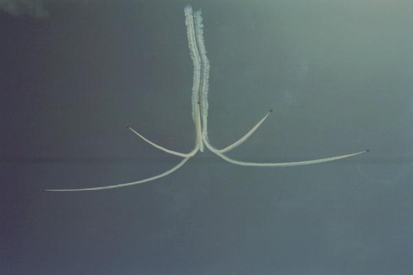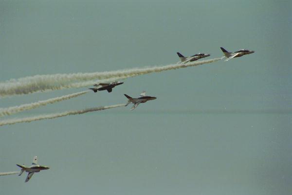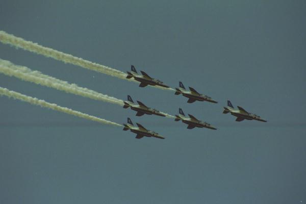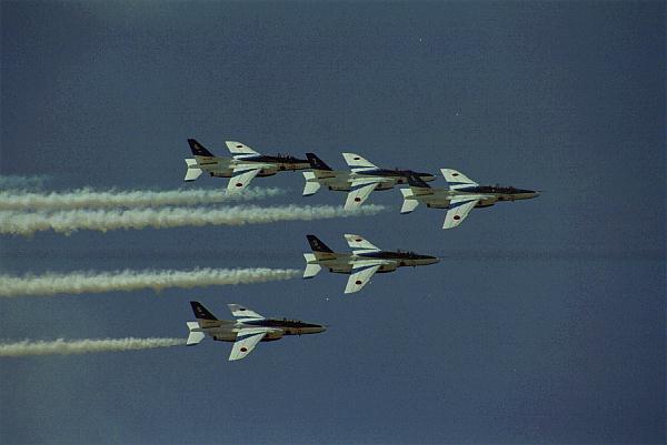 5番機と6番機がすれ違う瞬間。高度差があり、上の機体がはみ出している。400mmで撮影。