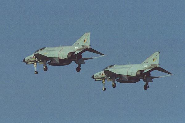 車輪を降ろしたダーティ状態での航過飛行を実施するF-4EJ改 |