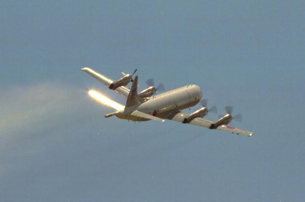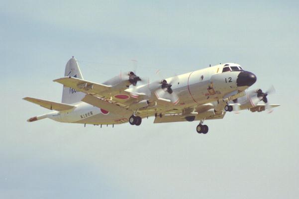 海上自衛隊のP-3C 1番左の第1エンジンを停止させての展示飛行 |