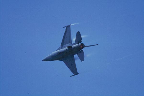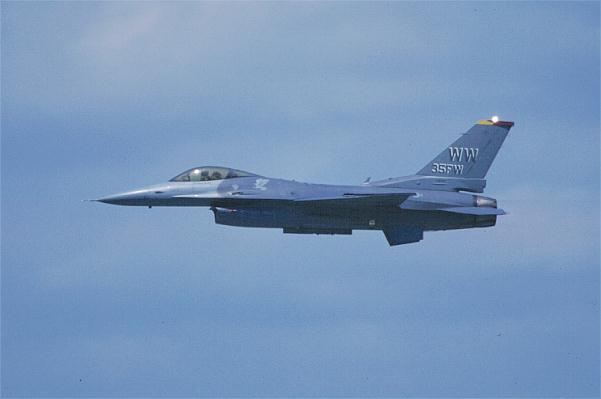 いきなりローパスで現れたF-16。離陸直後のように見えますが、防府から離陸したわけではありません。 |