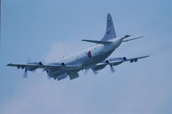 爆弾槽扉を開き、翼を振りながらローパスするP-3C |