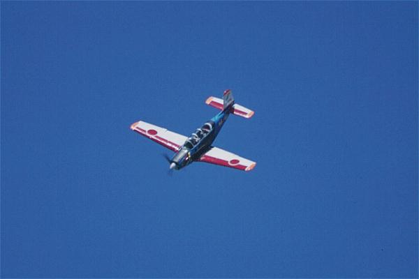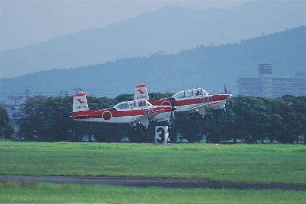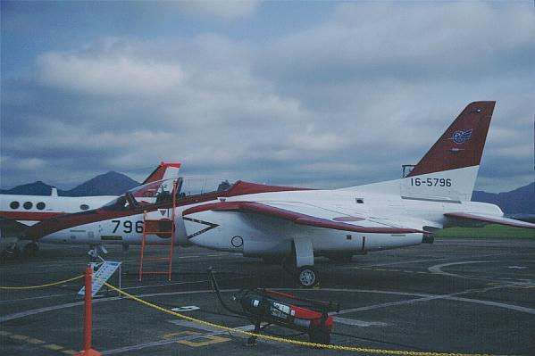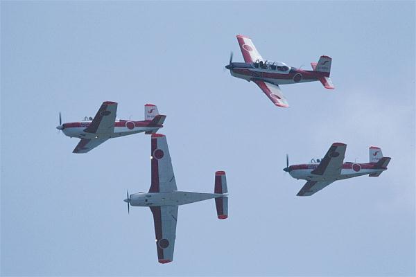 このHPでは、初になる芦屋基地のT-4。機首から尾翼にかけての塗装パターンはブルーインパルスと同じ。ただし、主翼と尾翼は前縁のみ赤でブルーインパルスとは異なる。色は日の丸と同じ赤 |