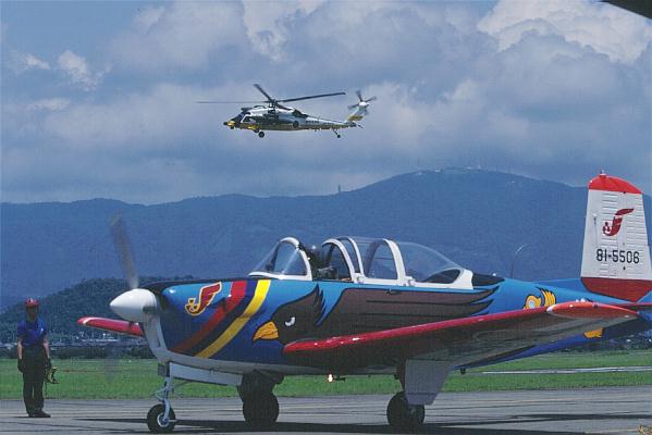 展示飛行のためにエンジンを始動したT-3記念塗装機と救難展示のために離陸したUH-60J