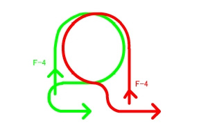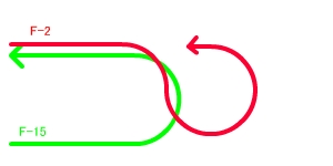 | 8:45〜9:20 | オープニングフライト (1)F-15が離陸→360度ターン→ハイレートクライム (2)T-3が離陸後275度旋回し、会場北側へ飛んで行く (3)T-2離陸 (4)F-4 2機が編隊離陸 (5)F-2 2機が編隊離陸 (6)T-2が南東から進入し、模擬対地攻撃 (7)F-4が2機編隊で南東から進入し、模擬対地攻撃 (8)F-2が2機編隊で南東から進入し、模擬対地攻撃 (9)T-2、F-4、F-4、F-2、F-2が次々と単機で南東から進入し、模擬対地攻撃 (10)F-15が離陸し、飛行場の周回飛行に入り、東から再進入。離陸するもう一機のF-15をピックアップ (11)(10)で離陸したF-15が2機編隊で南西から北東へ航過 (12)F-2 2機編隊が東から進入し8字旋回を実施、実施後2機は編隊をブレイクし、それぞれ東西に飛行して行く (13)F-4 2機、T-2が正面から進入し、水平開花 (14)F-15、F-2、T-3が編隊を組んで航過 (15)F-15が360度旋回を実施、その後急上昇を実施 (16)F-2、F-15が下図のような旋回交差機動(以下こう呼びます)を実施 (17)上記機動後、F-15、F-2がそれぞれタッチアンドゴーを実施 (18)T-2がコンバットピッチを実施し、着陸 (19)F-4 2機編隊がコンバットピッチを実施し、着陸 (20)T-3が会場北から進入し、右360度旋回を実施後着陸、 (21)F-2 2機編隊がコンバットピッチを実施し、着陸 (22)F-15 2機編隊がコンバットピッチを実施し、着陸 |