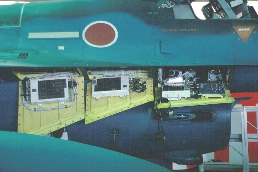 格納庫で油圧系統駆動展示に使われていたF-2.メンテナンスパネルが開けられており、パネルに取り付けられたメンテ用のスイッチボックスが見えています。 |