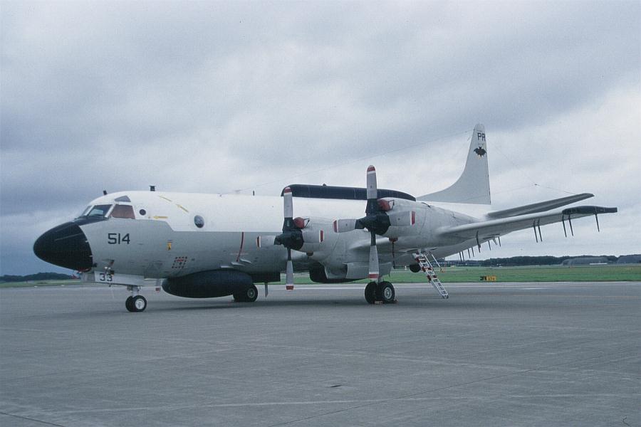 アメリカ海軍のEP-3。中国軍戦闘機と空中衝突したのと同型機。前部胴体下面に皿型、後部上下にカヌー型レドーム。翼端下方と尾部下に多数のアンテナが突き出している |