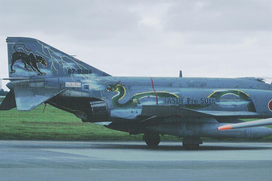 プレ50周年記念塗装のF−4。8SQのシンボル黒豹が、胴体の竜と睨み合い。会場中央に展示されていたがオープニングフライト終了後、引っ張っていかれました。 |