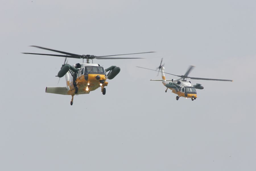左のUH-60Jが救助する横を通過するUH-60J |
