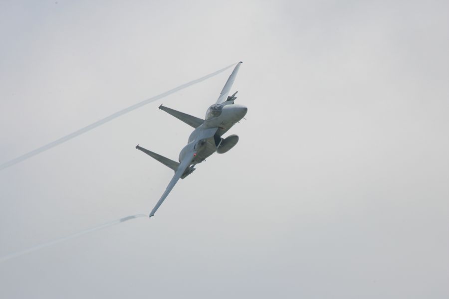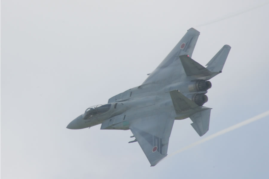 対地攻撃展示で航過後離脱するF-15。F-15は3機が航過するのみで、対地攻撃というか、VADSの対空射撃がメインというところかな |