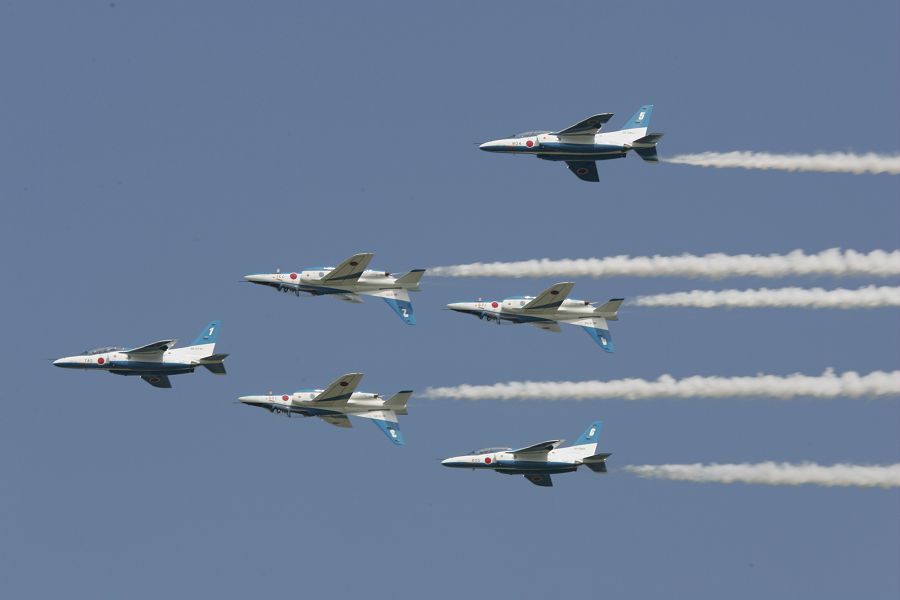 ブルーインパルスの新課目。インバーディット・トライアングル。2、3、4番機が背面飛行をしている。