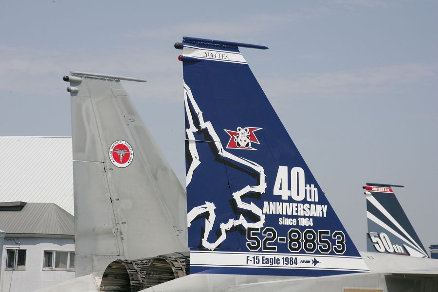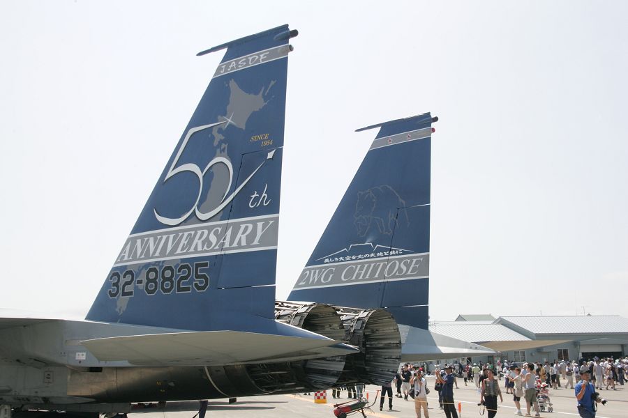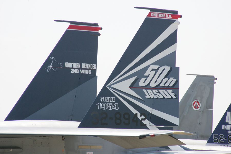 | 航空自衛隊創設50周年記念塗装機。第2航空団としてのF-15記念塗装機。尾翼外側(右)と内側(左)では描き分けている。左エアインテイク側面には桜を背景に飛翔する鷲が描かれていました。また主翼上面にも描かれているようですが、地上から確認できませんでした。 |