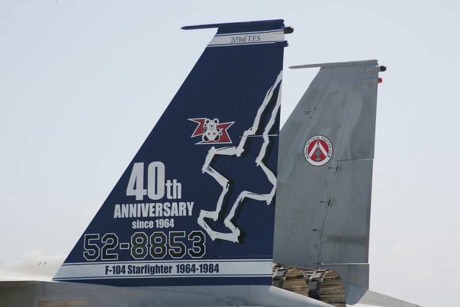 こちらは左から撮影。右がF-15、左がF-104となる。また、右尾翼の内側にはF-104マーク。左尾翼の内側がF-15マークであることに注意。 |