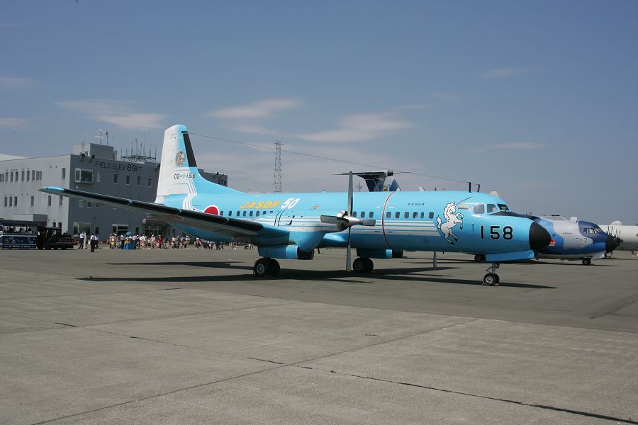 美保から飛来のYS-11記念塗装機「ユニコン号」(勝手に命名)右奥のC-1は防府に飛来した「魔女空輸号」(勝手に命名)。魔女とユニコンとはファンタジーですね。 |
