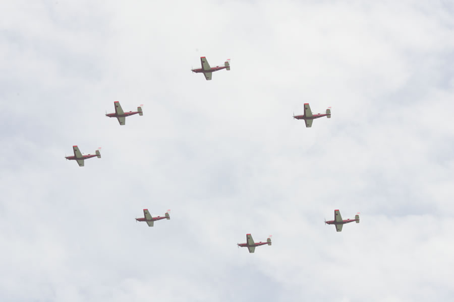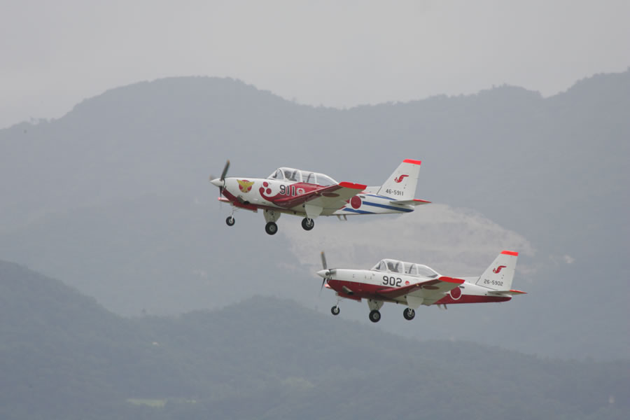 | オープニングフライトに向け離陸するT-7。先頭機は記念塗装機です。 |