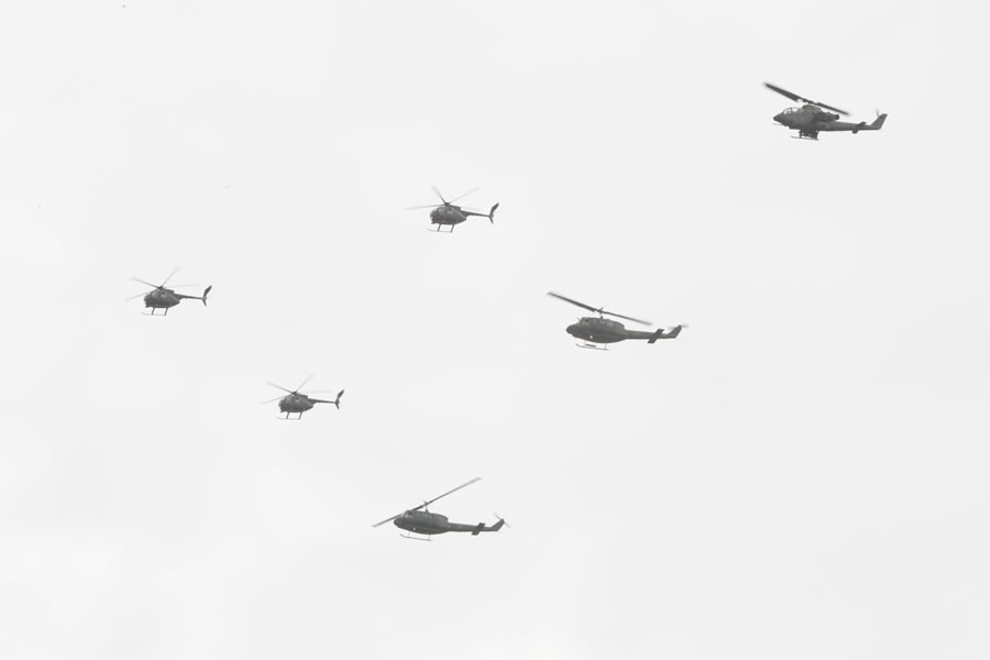 オープニングフライトを行う陸上自衛隊のヘリ。先頭3機はOH6、右上がAH-1、残り2機はUH-1。 |