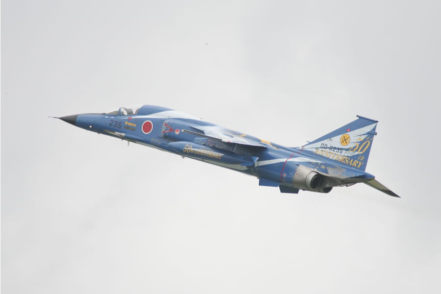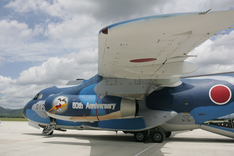 | 濃緑と緑の通常迷彩を濃紺と青に塗り替え、エンジンに50周年の文字と絵を入れた入間基地のC-1 |