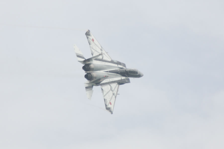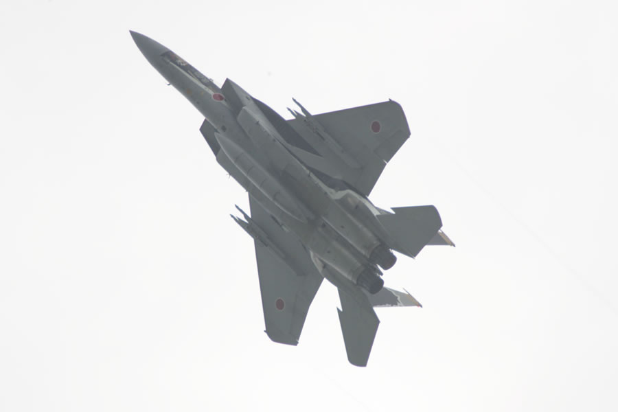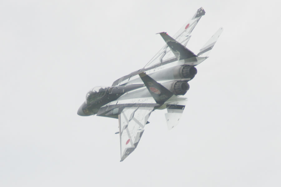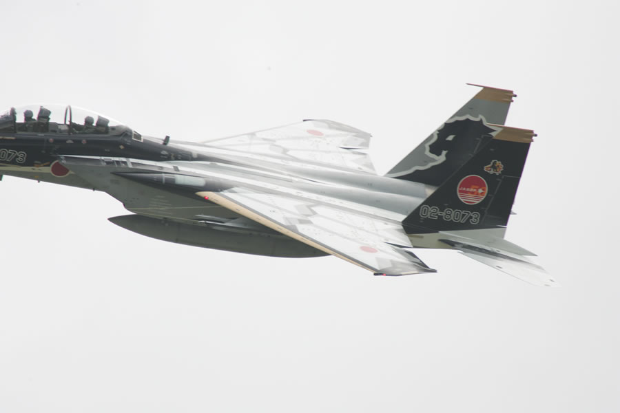| 新田原から飛来した23飛行隊のF-15。水平飛行から急上昇を実施。記念塗装機。機体側面に塗装がおよんでいます。 |