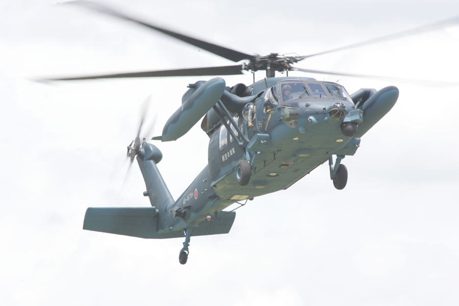 | 救難展示のため、ホバリング中の新田原救難隊のUH-60J。濃紺と青に迷彩されています。 |