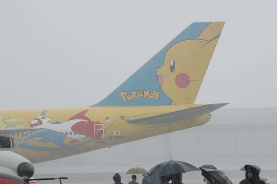 13時ごろ。もっとも風雨の強かった時です。雨でポケモンも霞んで見えます。格納庫内からの撮影です。 |
