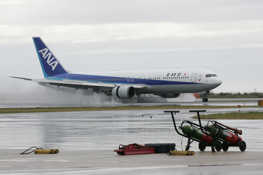 雨は止んでも滑走路は、お池状態。水しぶきというか、水を掻き分けて、着陸してきたB767。 |