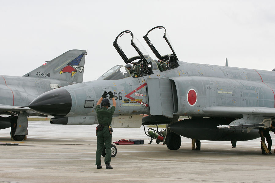 | グランドクルーが停止の合図を送り、F-4は停止します。 |