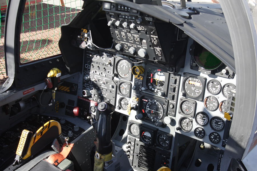 F-15のコクピット。右側2列は、左右のエンジン関係で、上から回転数計、温度計、燃料流量計、ノズル開度計。その左列は上から、高度計、昇降率計、時計。中央、上が姿勢儀、下が水平儀。その左の上から速度計、迎え角計、Gメータ。一番左は兵装パネル。中央上部の斜めになったパネルの下側が、HUD操作関連。上側は無線。上部右側の丸いのは電子戦の情報表示器。HUD操作パネルの左側、黒く写っているところの奥にレーダスクリーンがあります。 |